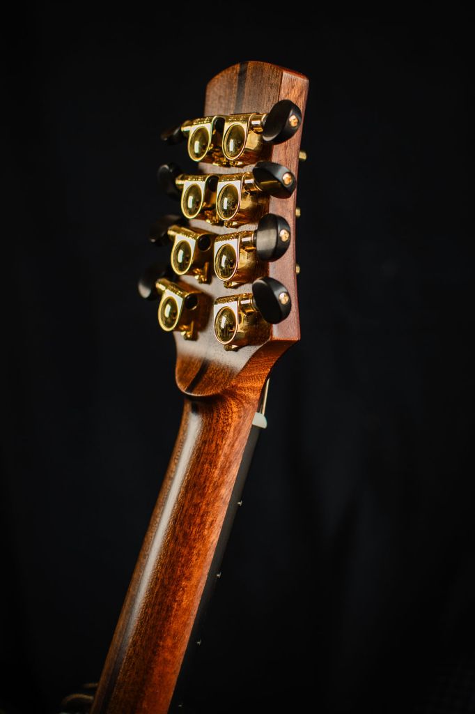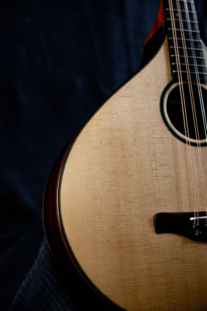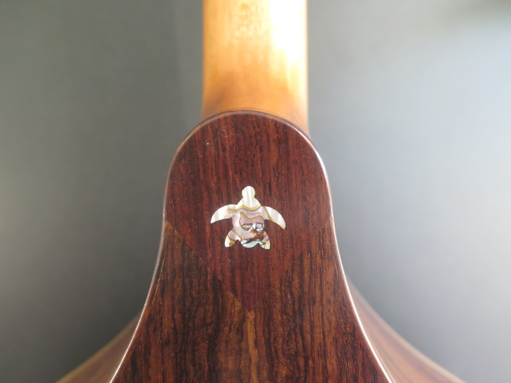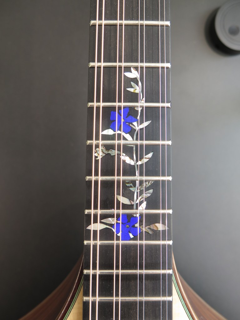 „Nelson Mandola“ in Haselfichte und ostindischem Palisander, Perlmutt Immergrünranken auf dem Griffbrett und klein Groß A‘Tuin auf dem Halskäppchen.